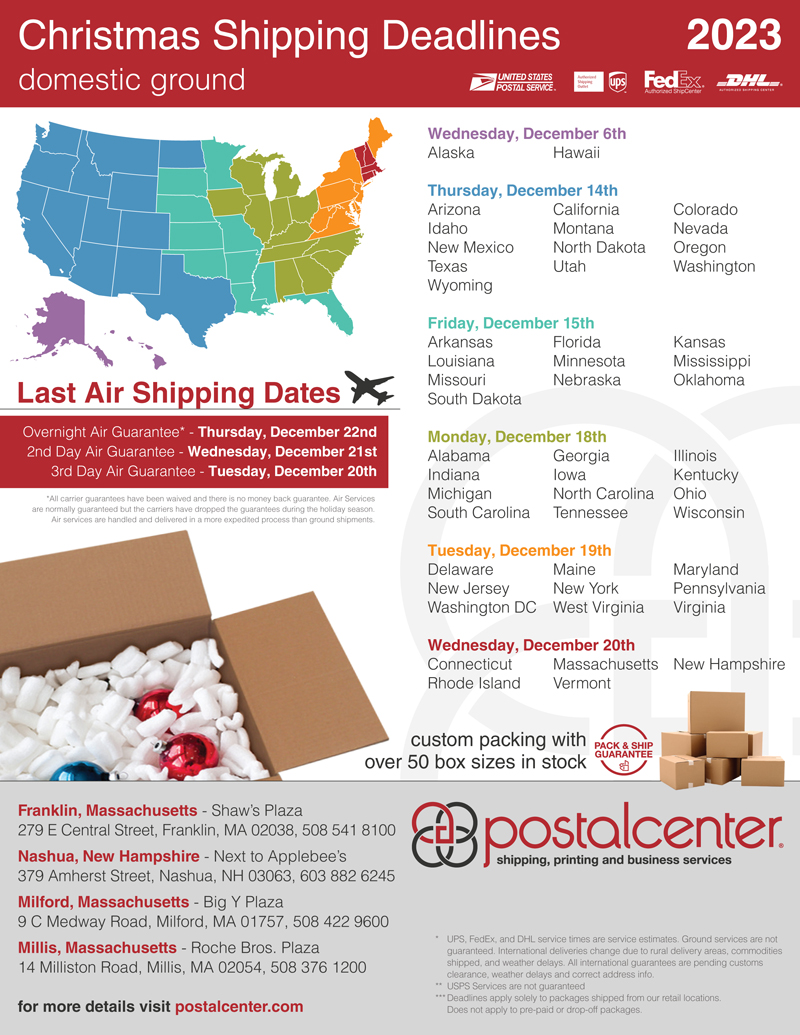 The 2023 Holiday deadlines are here. Below are dates for Ground Services as well as Air Express Services. Domestic and International deadlines are all listed here. Please note that these times are calculated on shipments sent from one of our New England locations.